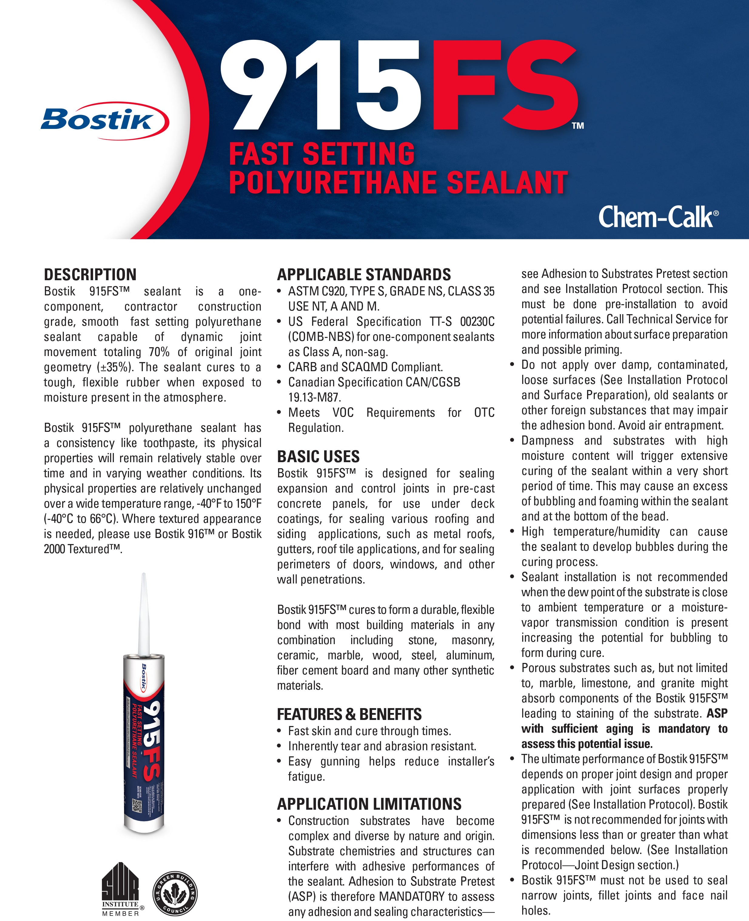 Bostik 915FS™ is a one-component, contractor-grade, fast-setting polyurethane sealant designed for construction applications. It provides smooth application and accommodates dynamic joint movement up to 70% of the original joint size (±35%). When exposed to atmospheric moisture, it cures to form a tough, flexible rubber.